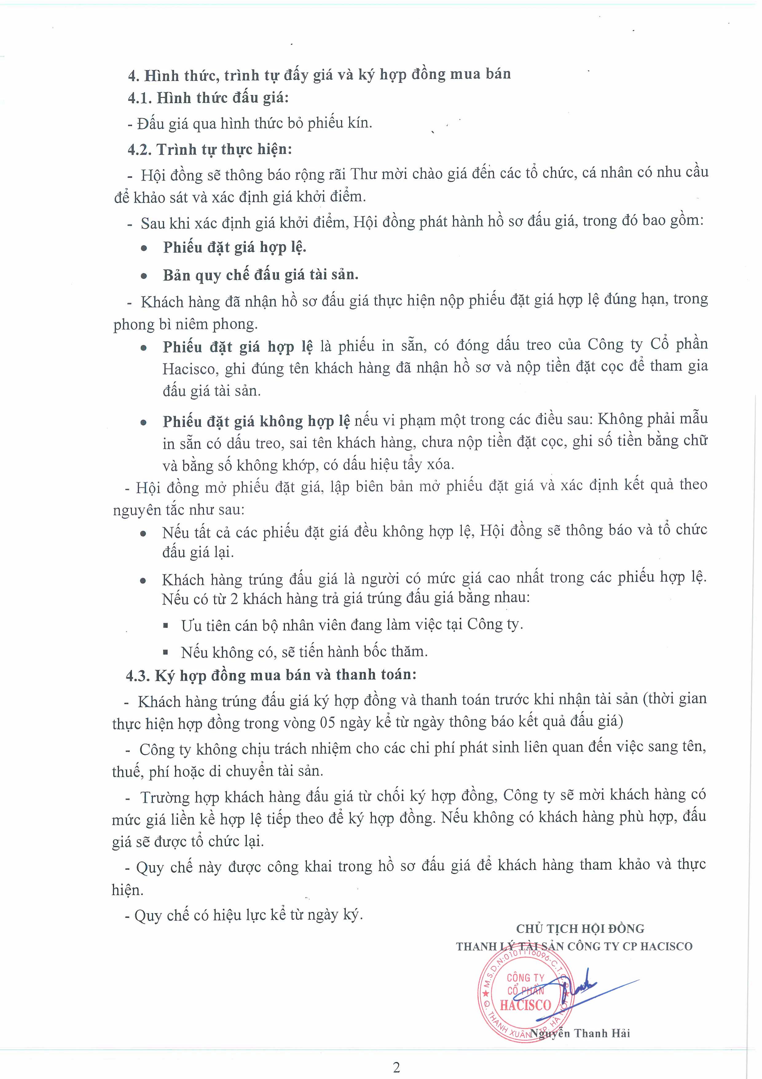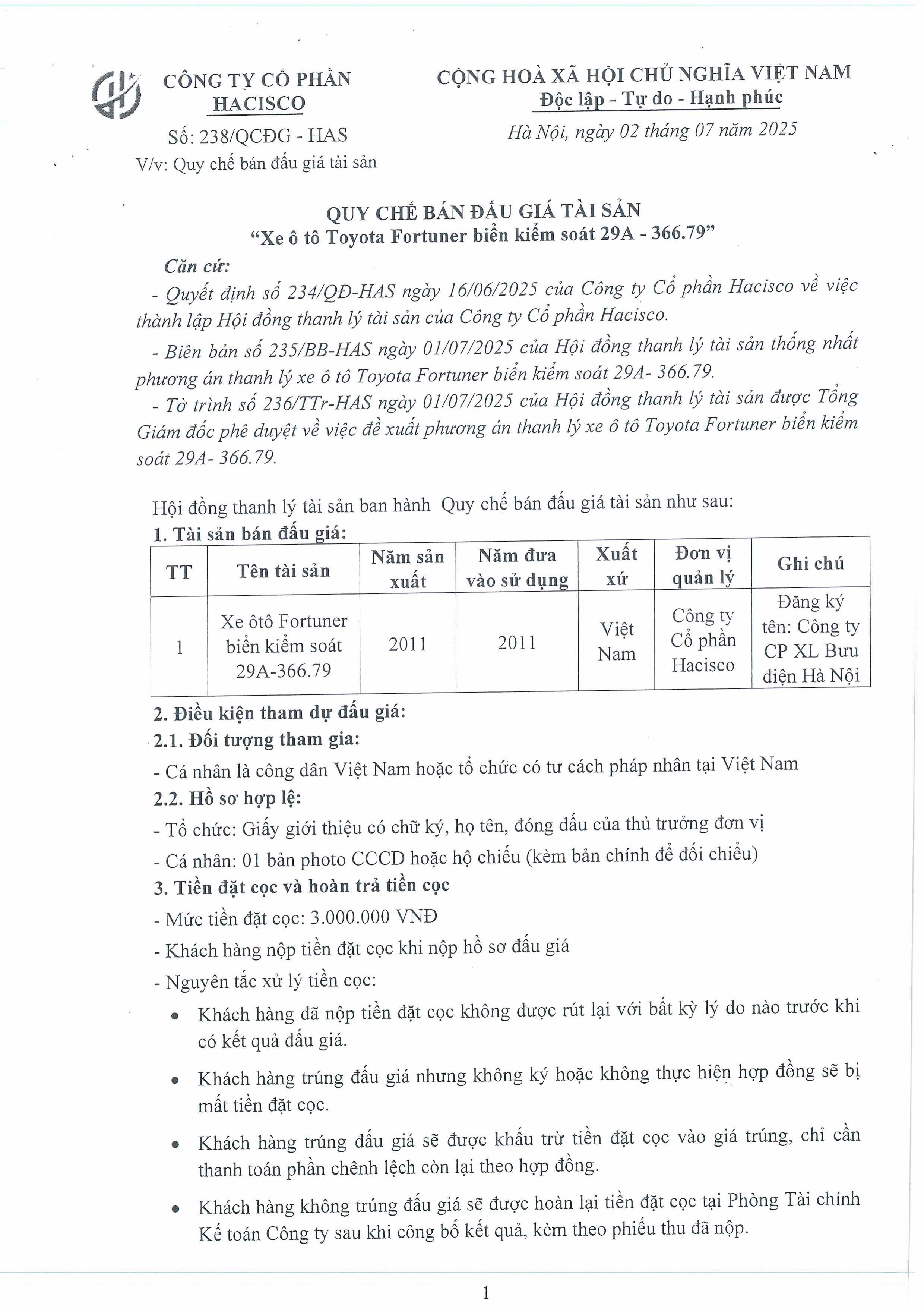 CÔNG TY CỔ PHẦN HACISCO - QUY CHẾ ĐẤU GIÁ TÀI SẢN "XE Ô TÔ TOYOTA FORTUNER BIỂN KIỂM SOÁT 29A-366.79" July 2, 2025
