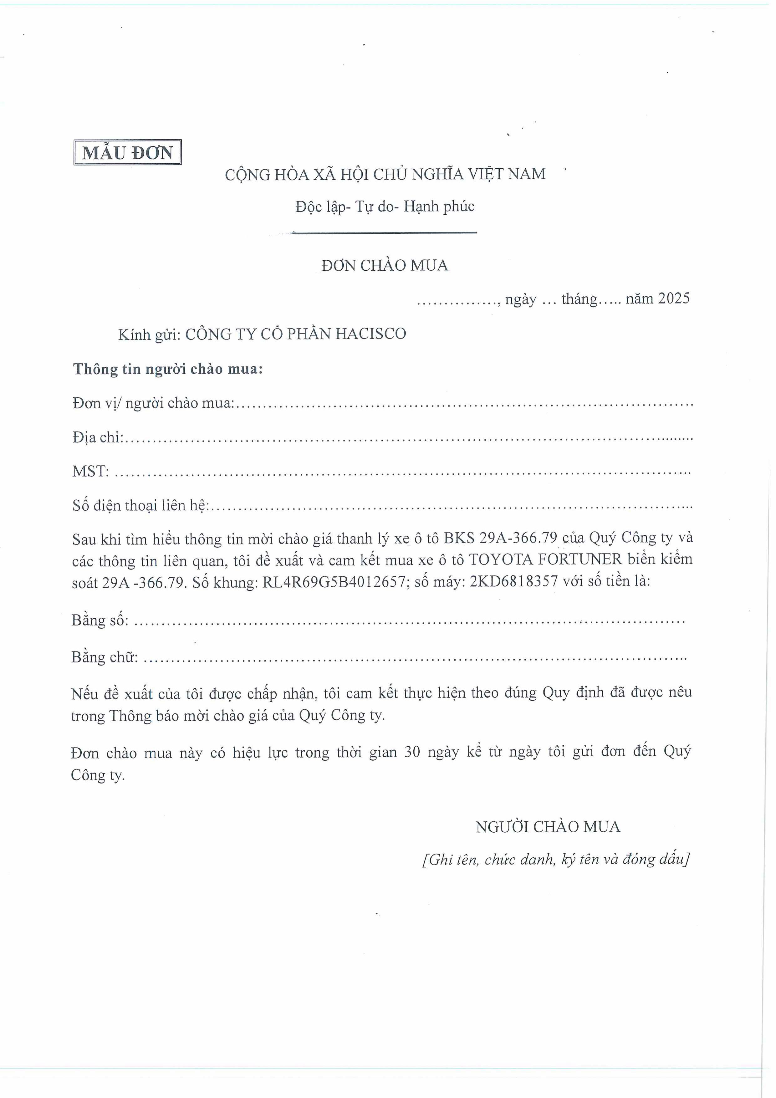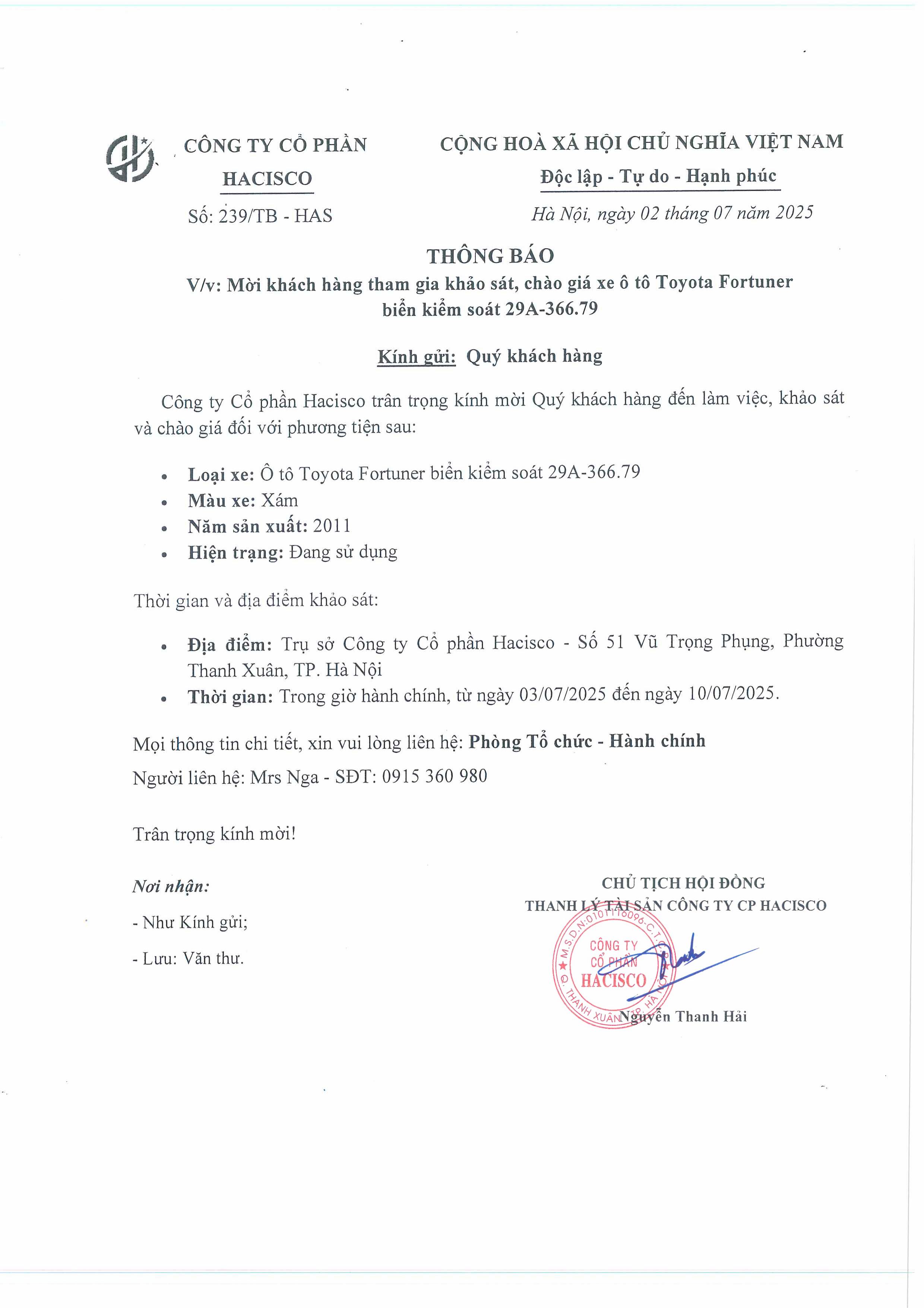 CÔNG TY CỔ PHẦN HACISCO - THÔNG BÁO MỜI KHÁCH HÀNG THAM GIA ĐẤU GIÁ "XE Ô TÔ TOYOTA FORTUNER BIỂN KIỂM SOÁT 29A-366.79" July 2, 2025
